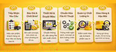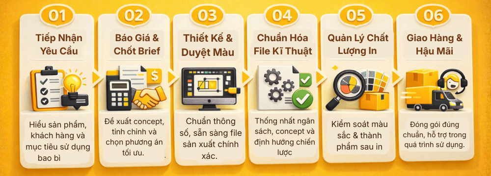 Quy trình của ONEST PACK được xây dựng theo mô hình One-stop Packaging, kết nối liền mạch từ ý tưởng, thiết kế đến in ấn và giao thành phẩm. Mỗi bước đều được kiểm soát để đảm bảo bao bì đúng thương hiệu, đúng kỹ thuật và tối ưu chi phí.